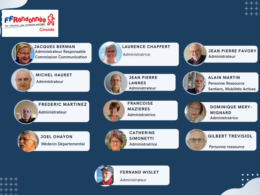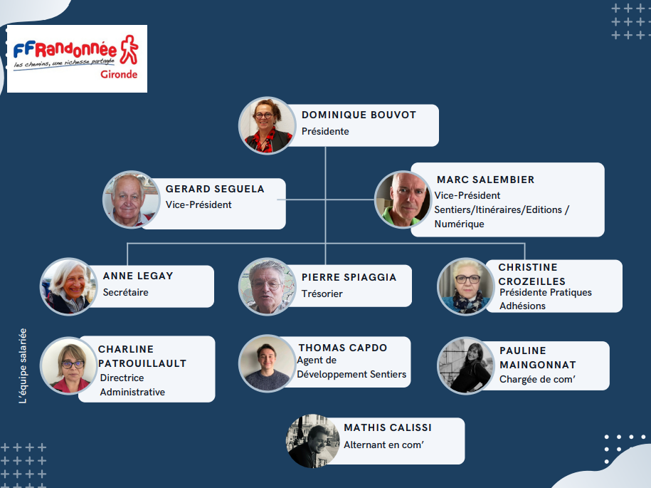 Le Comité FFRandonnée Gironde, association Loi 1901, fonctionne grâce à des bénévoles et des salariés. Chaque année, ils présentent leurs actions lors de l’Assemblée générale. Le Comité directeur, composé d’administrateurs élus pour 4 ans, décide des actions à mener. Il se structure en commissions qui pilotent les projets, tandis que le Bureau gère la gestion courante. Les salariés assurent la coordination et le bon déroulement des actions, en soutien aux bénévoles.